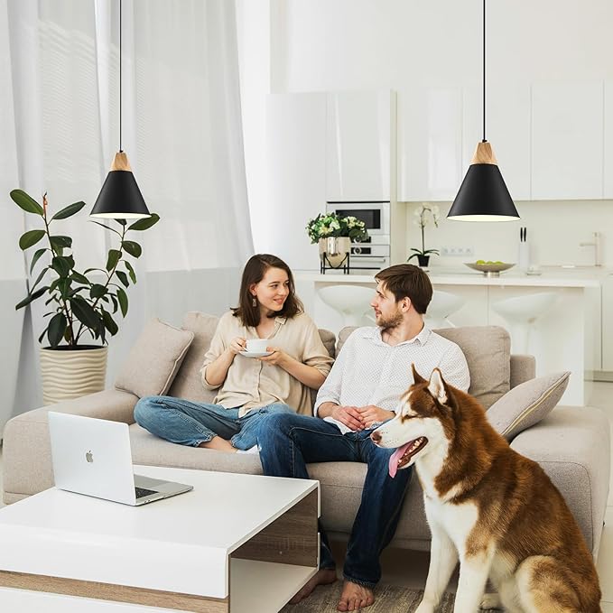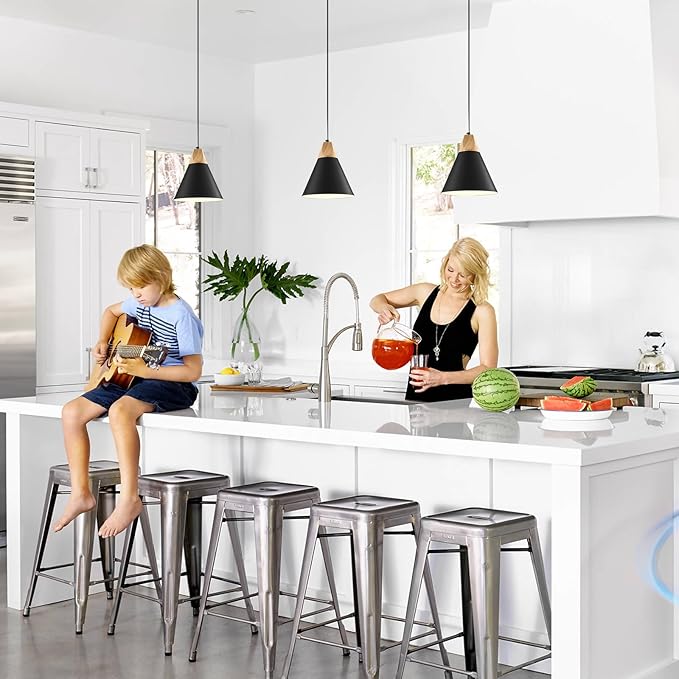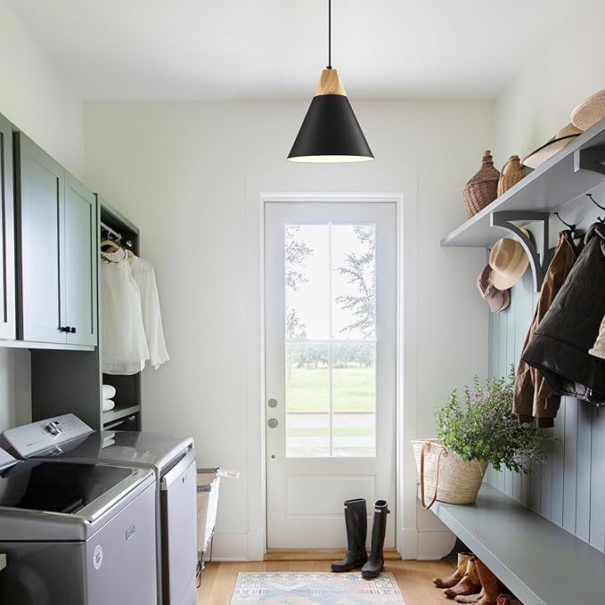 BLACK PENDANT LIGHT WITH WOOD ACCENT – Features a sleek matte black finish with natural wood trim, adding a warm farmhouse touch to your kitchen island, dining area, or hallway decor.