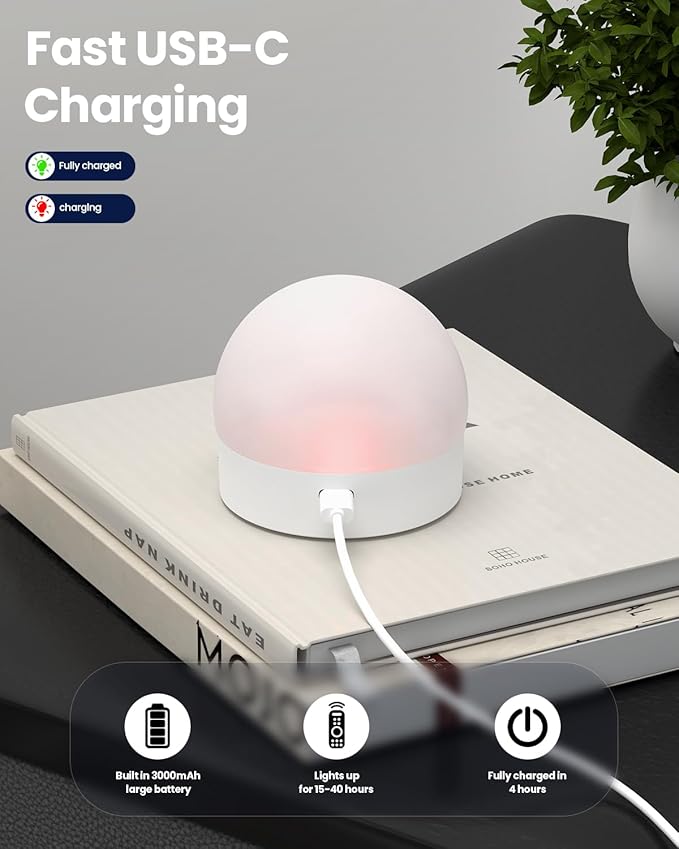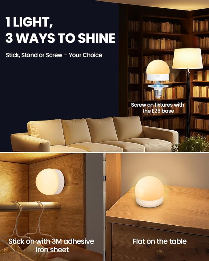 • 【15 Colors & 10 Dimming Levels】Our rechargeable light bulbs switchs between warm/neutral/daylight white for reading or tasks, or energize spaces with 12 vibrant RGB colors. These battery operated light bulb adjust brightness 10%-100%—perfect for nursery night-lights, movie nights, parties, or creating focus zones