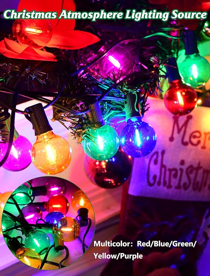 • E12 Base Round Multicolor Christmas Lights - This 25ft globe Christmas lights include 27 LED Clear Colored Christmas lights (2 spares). The G40 LED Christmas lights emit a vibrant array of colors, enhancing the festive atmosphere. (Colors: red, blue, green, yellow, purple)