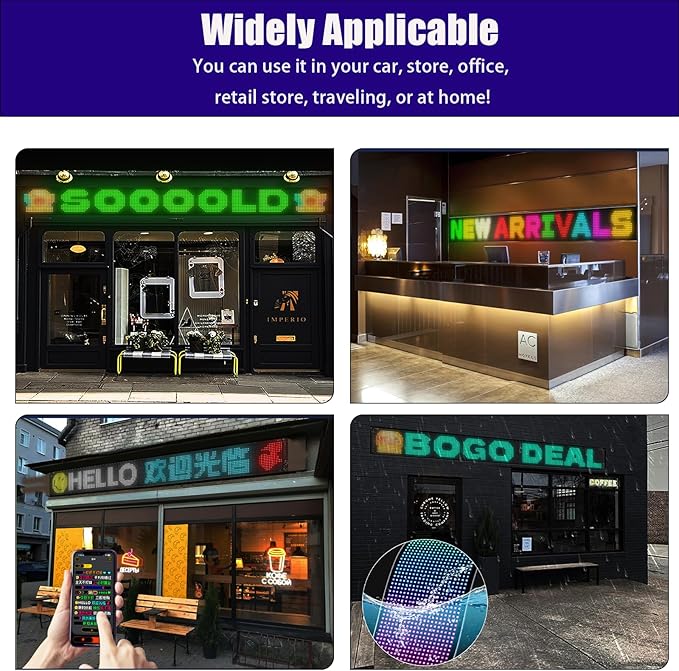 • Pro-Grade Customization - Upload GIFs, logos, or DIY patterns with intuitive app editor create unique light shows. Dual-layer circuit boards prevent overheating, while ultra-wide panels fit semi-truck windshields.