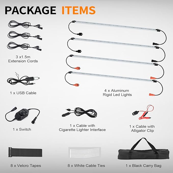 • 【COMPLETE PORTABLE SET】4 x 22-inch 12v led light, 1 x cigarette lighter plug connector cable, 1 x battery clip connector cable, 1 x dimmer switch, 1 x USB connector cable, 1 x TYPE-C adapter, 8 x Velcro fasteners, 3 x extension cables, 1 x portable bag