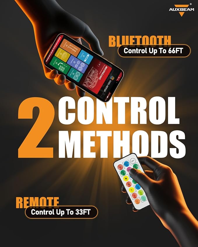 • APP & REMOTE CONTROL:‌ Take full command via the ‌Cool Motor Bluetooth App‌, or ‌the included RF remote!‌ Choose from ‌180 dynamic lighting modes‌, sync lights to ‌music beats (Music Mode)‌, or activate ‌voice-responsive lighting (Voice Mode)‌—where rock lights react instantly to your ‌voice pitch and rhythm‌. Use ‌Group Management‌ to effortlessly sync multiple AUXBEAM lights compatible with Cool Motor—all from one app