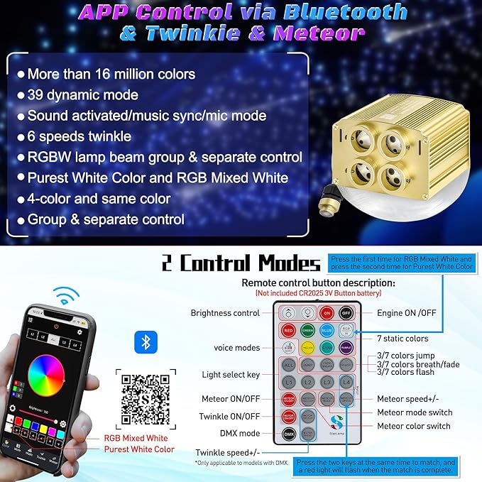 • 【Twinkle & Meteor 2-in-1 Combo】The 4-port design can accommodate more fiber, Built-in turntable wheel,which can be made the star sky fiber lights to show the Flicker and Dimming effect like Shooting Stars or fireworks effects, depends on where the fiber is installed, make the starry sky more realistic, giving you an amazing visual experience. The shooting car star lights interior roof effect of the upgraded 2 in 1 design provides both Twinkle and Meteor effects in a single light engine.