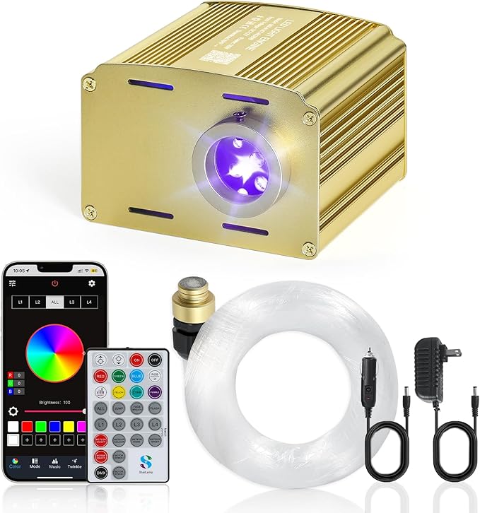 • Included Components : 1x (200pcs*0.03in*9.8ft) Fiber Optic Cable, 1x 16W Light Engine, 1x Power Adapter&1x Car Use Plug, 1x RF Remote Controller, 1x User Manual 1x (200pcs*0.03in*9.8ft) Fiber Optic Cable, 1x 16W Light Engine, 1x Power Adapter&1x Car Use Plug, 1x RF Remote Controller, 1x User Manual