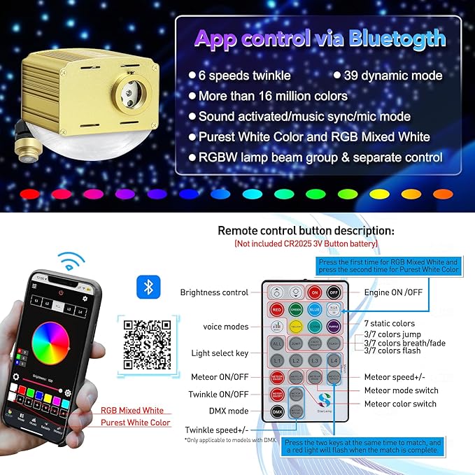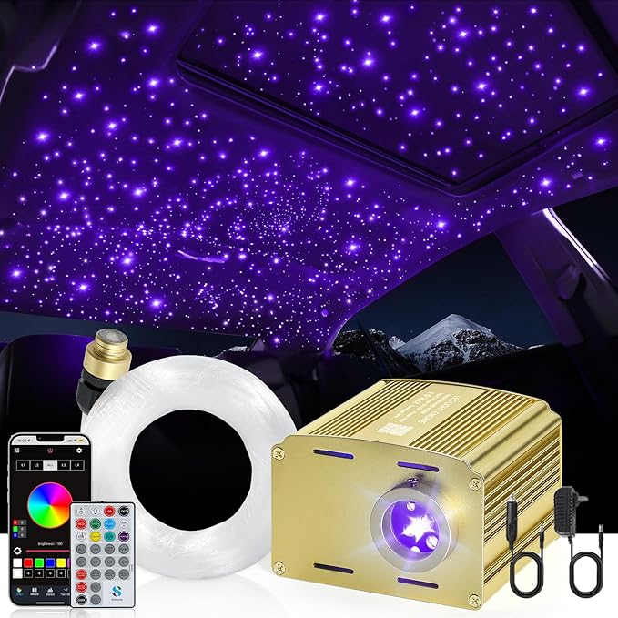 • 【Twinkle & Music Sensor】The holding maximum 650pcs 0.03in fber per port, Built-in turntable wheel,which can be made the star sky fiber lights to show the Flicker and Dimming effect like stars, make the starry sky more realistic, giving you an amazing visual experience. Sound sensitive mode of the car star lights interior roof car can sync any sound captured from microphone, then change colors following the music rhythm as well as your voice, Car audio, applause, etc.