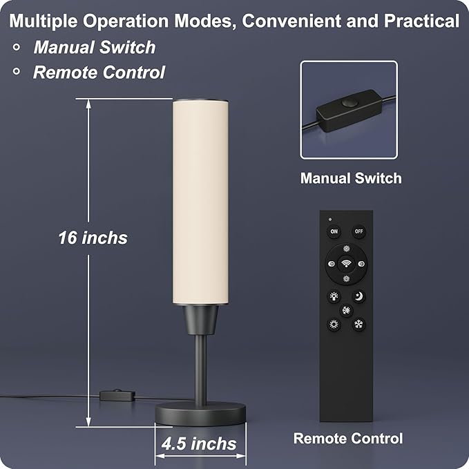 • 【Remote control and manual switch】: With the remote control, you can easily control the table lamp for bedroom within 10 meters, even through the wall. At night, you don't need to search for the nightstand lamp switch in the dark. Just press the "On" button on the remote control lightly. Especially in winter, it's a uncomfortable thing to get out of the warm bed to turn the light on and off. Of course, this table lamps can also be manually turned on and off.