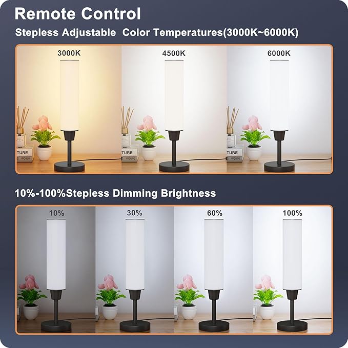 • 【Adjust brightness and color temperature】: With the remote control, you can easily set your favorite brightness (10%-100%) and color temperature (warm light 3000k- cold light 6000k), creating a unique lighting atmosphere that belongs to you. For example, cool white light, relaxing warm light, and natural light for illumination, etc. The side table lamp has a memory function and can turn on the light according to your last Settings.