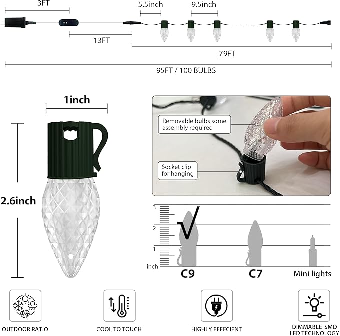• IP65 Waterproof Design for All-Weather Use: With an IP65 waterproof rating, Aoycocr C9 LED Christmas Lights are built to last through rain, snow, and sunshine. Ideal for outdoor Christmas lights, garden décor, and year-round use.