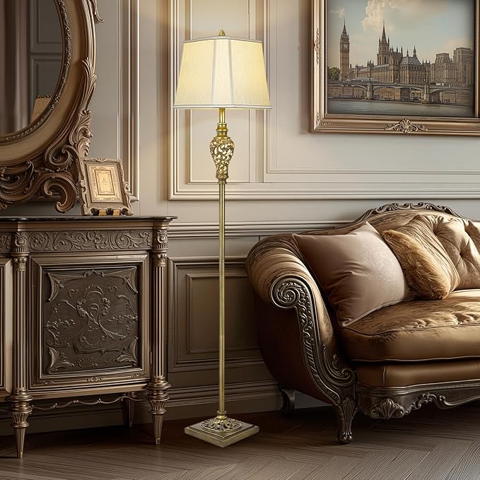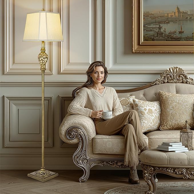 • SIZE: Total lamp height is 65 inches. It comes with a bell-shaped faux silk lampshade that is 15 inches wide and 10.5 inches high. Supported by a 9-inch square base and saves space. Includes a 9W LED main light bulb, no need to purchase separately.