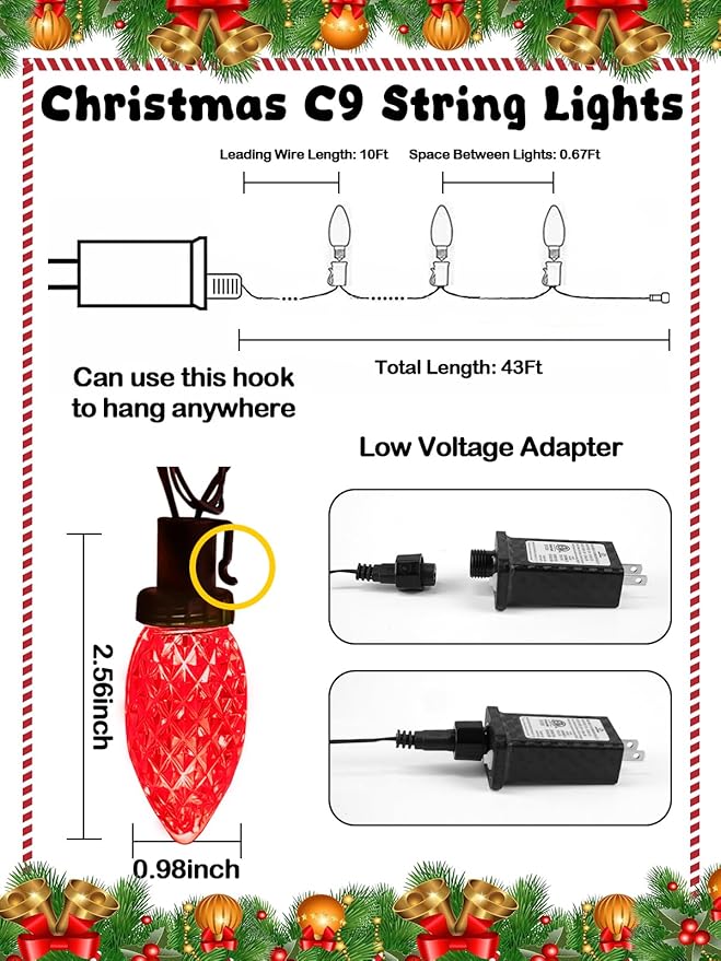 • Extendable & Safer Design: These C9 Christmas string lights are equipped with a 29V low-voltage plug and are ETL certified for safe use. You can connect and extend up to 4 sets together, making them ideal for decorating larger outdoor spaces or wide areas. Plus, the 10 ft leading wire provides added flexibility for outdoor setup and placement