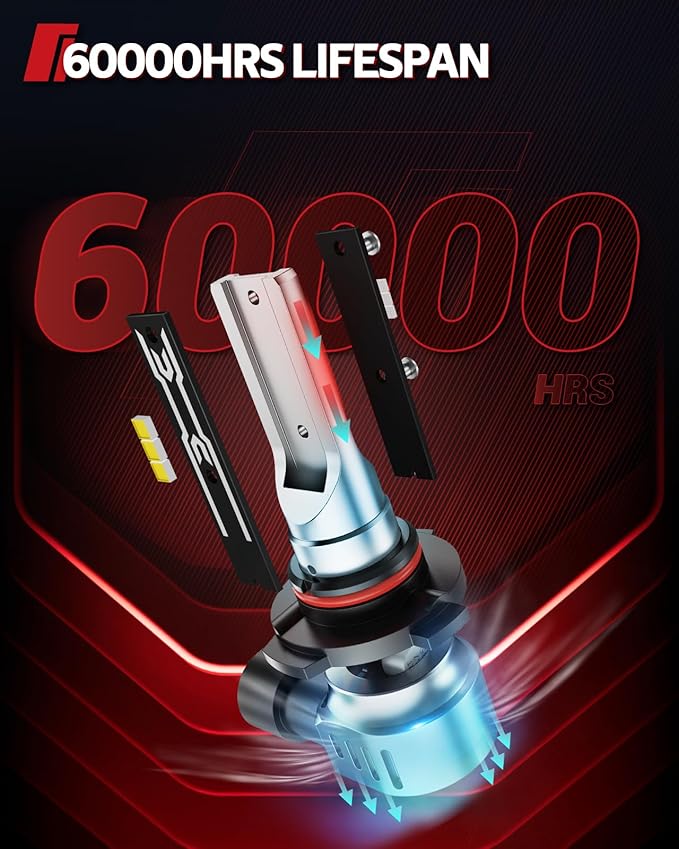 • 60,000HRS Lifespan: H10 LED fog light bulbs with aircraft-grade aluminum housing and riveted construction—no loose parts even on bumpy roads, ensuring the H10/9145 fog light bulb service life over 60,000 hours