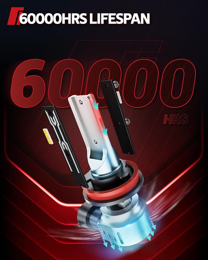 • 60,000HRS Lifespan: H11/H16/H8 LED fog lights with aircraft-grade aluminum housing and riveted construction—no loose parts even on bumpy roads, ensuring the H11 fog lights LED bulb service life over 60,000 hours.