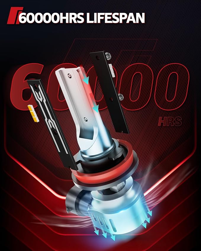 • 60,000HRS Lifespan: H11/H16/H8 Yellow LED fog lights with aircraft-grade aluminum housing and riveted construction—no loose parts even on bumpy roads, ensuring the H11 Yellow fog lights LED bulb service life over 60,000 hours