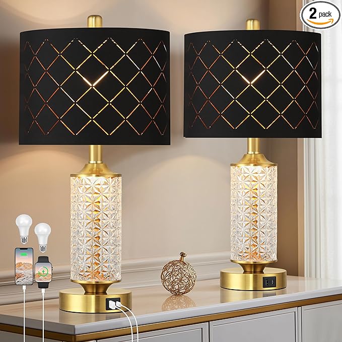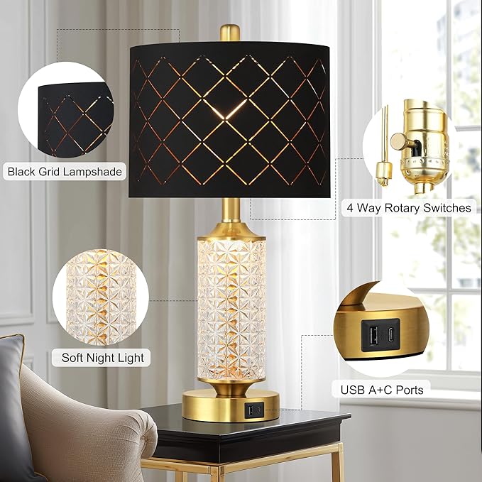 • 【Top Table Lamp and Bottom Night Lamp】This gold table lamp set of 2 offers a variety of lighting options. You will get regular table lamps and night lights, controlled on/off by a 4-way rotary switch: table lamp on, night light on, both on, both off, glass table lamp with USB providing you with enough lighting options to meet your different needs walking in the dark, accompany you before bed, gold table lamp modern also allows you to find your way easily and safely when you wake up at night.
