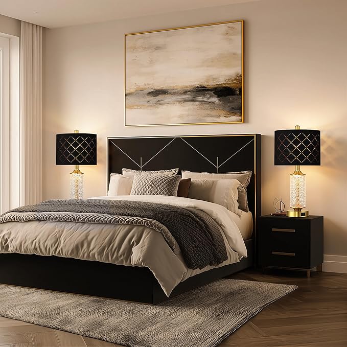 • 【Black Diamond-Patterned Linen Shade】 This living room lamp features a classic diamond-patterned shade that adds visual depth, while its gilded interior edge filters light through the lattice to emit a warm and soft glow—almost as if radiating golden rays. Blending minimalist aesthetics with a touch of luxury, it serves as an elegant accent for spaces such as the living room, bedroom, entryway, study, or office, making it equally suitable as a table lamp for bedroom settings or a versatile side table lamp.