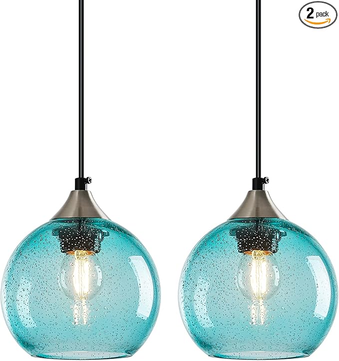 • 【Unique Design】This pendant light fixtures features a unique and stylish design, the light blue globe glass shade shows off the bulb and maximizes its light to create the room of your dreams! The sand nickel finish of metal part completes the look, showcasing your personal decor style