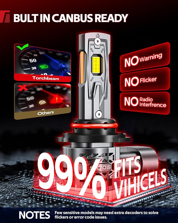 • 【99%+ Vehicle Compatibility】Torchbeam 9005 light bulbs are compatible with over 99% of vehicles. They eliminate errors and flickering and are designed to be CANbus-ready for a seamless experience. Note: Some sensitive models may require a CANbus decoder; feel free to contact Torchbeam for assistance if needed