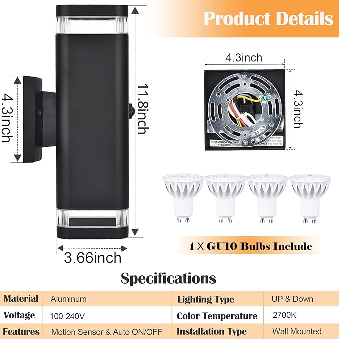 • Easy Installation & Versatile Application: Motion sensor porch lights outdoor come with clear instructions for fast, hassle-free setup. The exterior wall light is ideal for a variety of locations, including porches, patios, garages, front doors, hallways, and balconies. The included 6000K non-dimmable GU10 bulbs emit a cool yet cozy glow, allowing you to enjoy stylish lighting straight out of the box—no need for additional bulb purchases (For dimming, please use a dimmable GU10 bulb.)