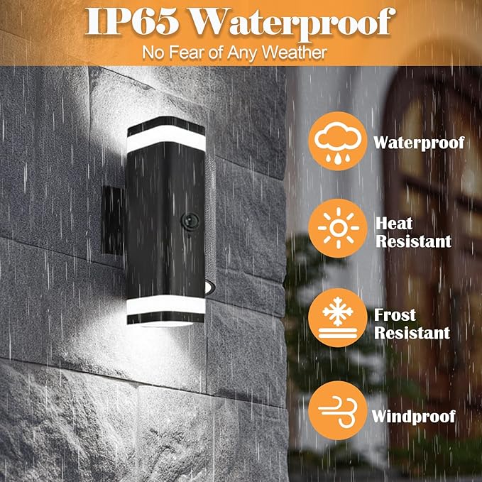 • Modern Up and Down Lighting Design: Sleek rectangular frame with a matte black finish and up and down lights outdoor porch light beam design adds a stylish, architectural look to your home's exterior. This outdoor garage lights not only improves nighttime visibility but also enhances curb appeal, even when turned off