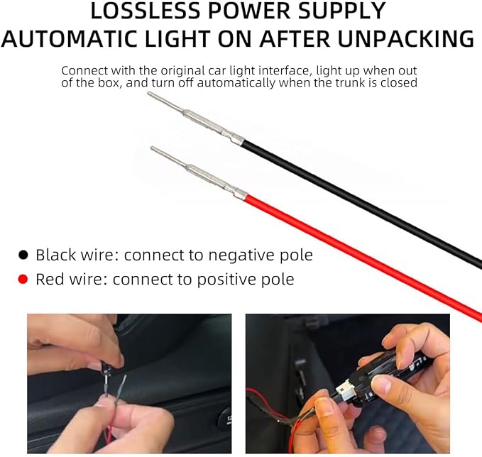 • Non-Destructive Installation: The trunk led light strip interior adopts the power connection method of pins, only need to connect the positive and negative wires to the original car lights, and then embed the light strip into the original adhesive strip in the tailgate, no need to break the wire installation.