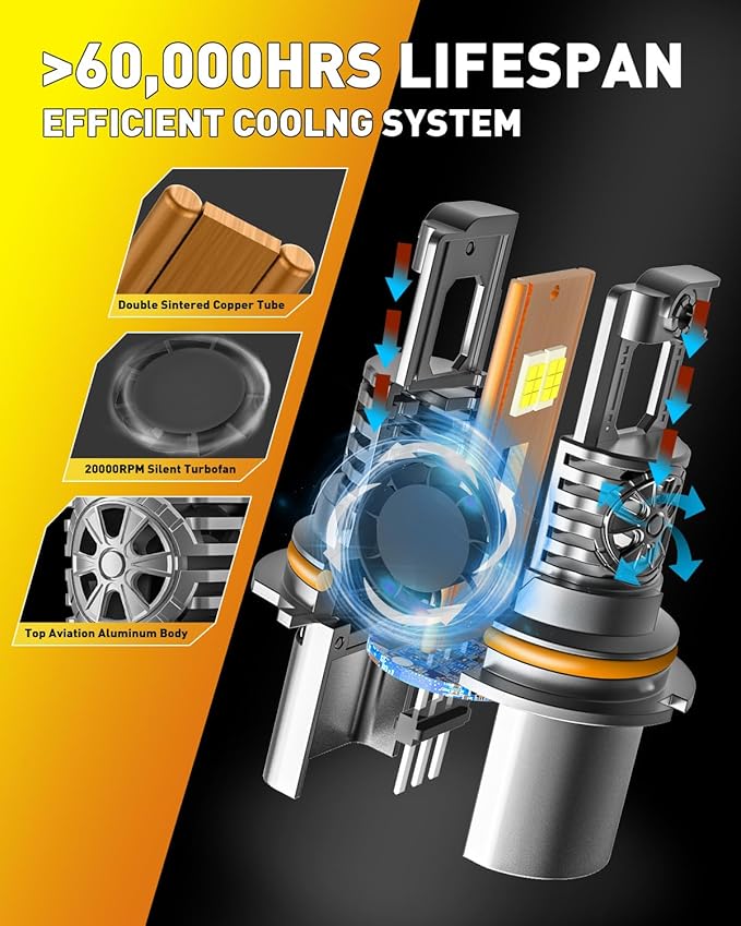 【Unrivaled Power and Performance】Crafted with precision from premium aviation-grade aluminum, complemented by a thermostatic copper plate and a high-speed 20,000RPM cooling fan, our bulbs feature an unparalleled cooling system. This ensures swift heat dissipation, maintaining stable and uninterrupted operation. With an extended average lifespan of 60,000 hours per light, you can count on reliable performance mile after mile.