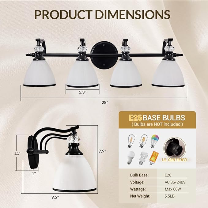 • Wires & Base You Can Trust: No cutting corners on safety both the E26 compatible socket wiring and metal base are UL-certified. That means rigorous testing for electrical safety, heat resistance, and durability. Whether in steamy bathrooms or well - used vanity spaces, this light fixture meets US safety standards to keep your home secure