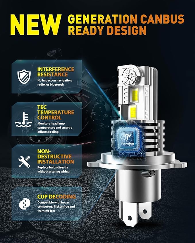 Easy 3-Minute Installation: Designed to fit seamlessly into your existing housing and factory socket without any modifications, the Termitor H4/9003/HB2 bulbs feature a 1:1 design with halogen bulbs. The non-polarized design and compact structure eliminate the need for oversized bases or additional drivers, making installation quick and hassle-free
