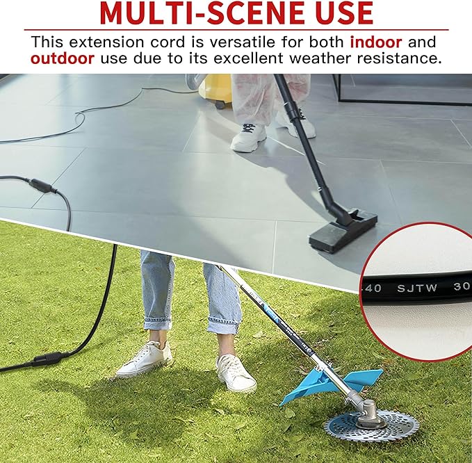 • ETL Listed and Trusted: 10 ft extension cord rated 13 Amps, 1625 Watts and 125 VAC; Male NEMA 5-15P and female NEMA 5-15R; It is ETL/cETL Listed; Ensuring its compliance with strict safety standards; Each outdoor extension cord passes a 2500V high voltage test before leaving the factory to ensure safety; Reliability and efficiency outdoor extension cord waterproof are capable of meeting most electrical needs; Please note that the “Indoor” label on the product is only a partial identifier; This product is actually safe for outdoor use as its external power cord is made of durable SJTW material; offering excellent outdoor abrasion resistance; moisture resistance and weather resistance