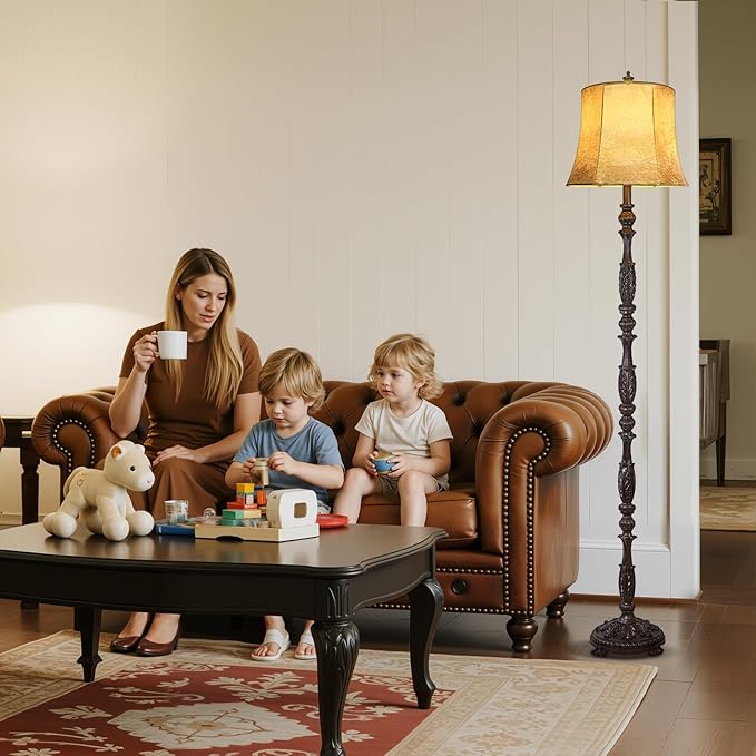 • RETRO FLOOR LAMP: Floor lamp has retro design, exquisite carved patterns resin body with dark brown finish, non-fading, solid construction, adds a warm, vintage charm that fits perfectly with retro style decor. Sturdy floor lamp, blending traditional elements and aesthetics, lights up your room space