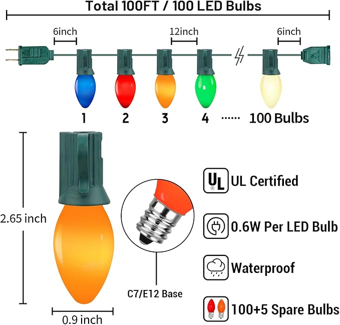 • 🎄【100FT C7 Multicolor Christmas Lights Outdoor】: 100 feet C7 LED Christmas string lights outdoor featuring 100 multicolor ceramic LED bulbs (red, blue, green, orange, white) plus 5 spare bulbs with christmas lights green wire specifications: 18AWG/2C, Male/Female Outlet 8A/120V/960W, C7/E12 candle base sockets. Vintage christmas string lights multicolor bulbs emit a natural warm glow, creating a cozy and enchanting Christmas atmosphere for your home and party.