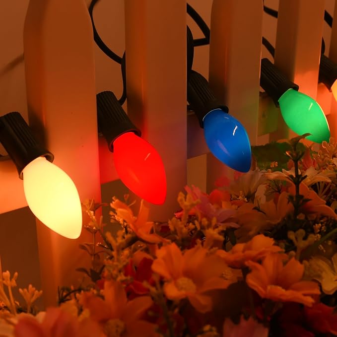 • 🎄【Easy Installation, Widely Used】: C7 bulbs can be easily screwed in and out for quick replacement of burnt-out bulbs or color changes. This set includes 5 spare bulbs. The C7 outdoor Christmas string lights feature small hooks for easy hanging on Christmas tree, wreath, door, window, and roof. Ideal for Christmas home decor, Christmas party decor, celebrations, backyard lighting, garden illumination, patio decor, wall decor and various decor/lighting occasions.