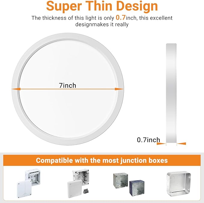 • 【Easy Installation】0.7 inch ultra-thin round led ceiling light can be recessed mounted and surface mounted in any ceiling area, the user-friendly base design can match 99% of junction boxes. There is no need to hire an electrician. We will provide installation instructions and one person can complete the installation in minutes