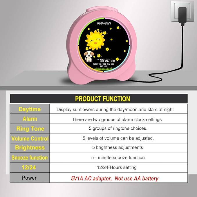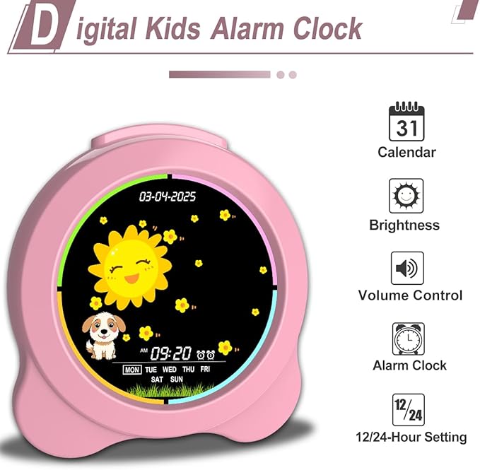 Kids Alarm Clock Sun & Moon LED Display with Day & Date OK to Wake Clock with Night Light for Kids Children's Sleep Trainer Gift for Boy and Girls (Pink)