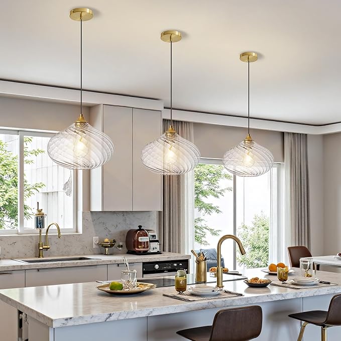 Glass Pendant Lights Kitchen Island, Brass Gold Pendant Lighting Fixtures, Modern Hanging Ceiling Light with 11'' Striped Clear Glass Shade for Farmhouse Dining Room Bedroom Hallway(1 Pack)