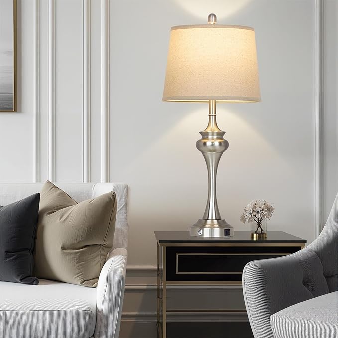 30" Silver Table Lamps Set of 2, 3 Way Touch Control Living Room Lamp with USB A+C Ports, Modern Brushed Nickel Bedroom Lamps, Tall Metal Bedside Lamp for Nightstand Desk Side Table Office