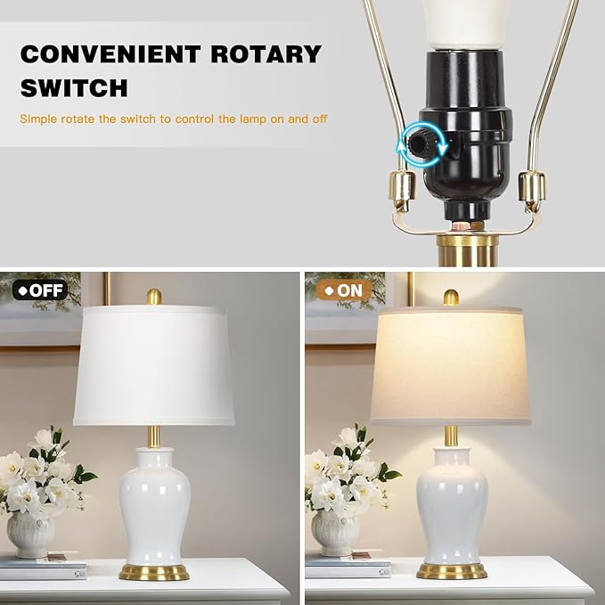 • 【Superior Quality 】The white ceramic table lamp is made of high-quality ceramic with smooth and shiny surface, durable, scratch-resistant and will not fade. The gold metal base adds a touch of luxury. Elegant lamps for nightstand can enhance the overall beauty of your home decor. The modern design adds character and warmth to your house, creating a cozy ambiance