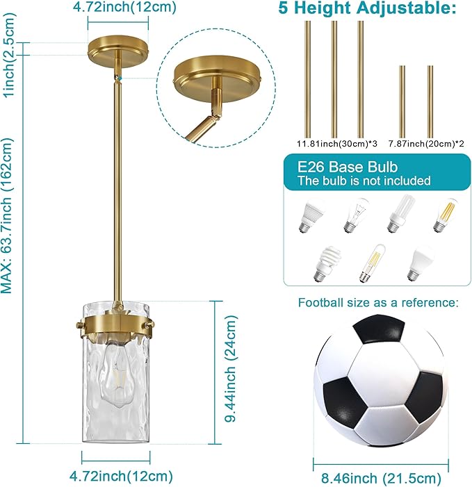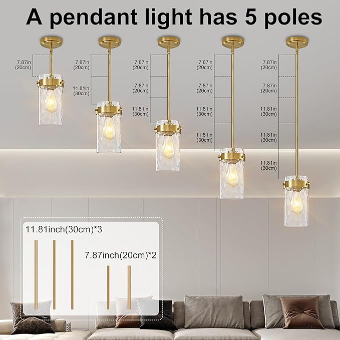 • 【Height Adjustable-5 Rod】 Height adjustable for easy customizing your lighting needs, Overall length: 63.7 inch, rod is made up of 3pcs 11.81inch and 2pc 7.87inch short rod. You can hang higher or lower as you want, farmhouse gold pendant lighting for kitchen island living room hallway