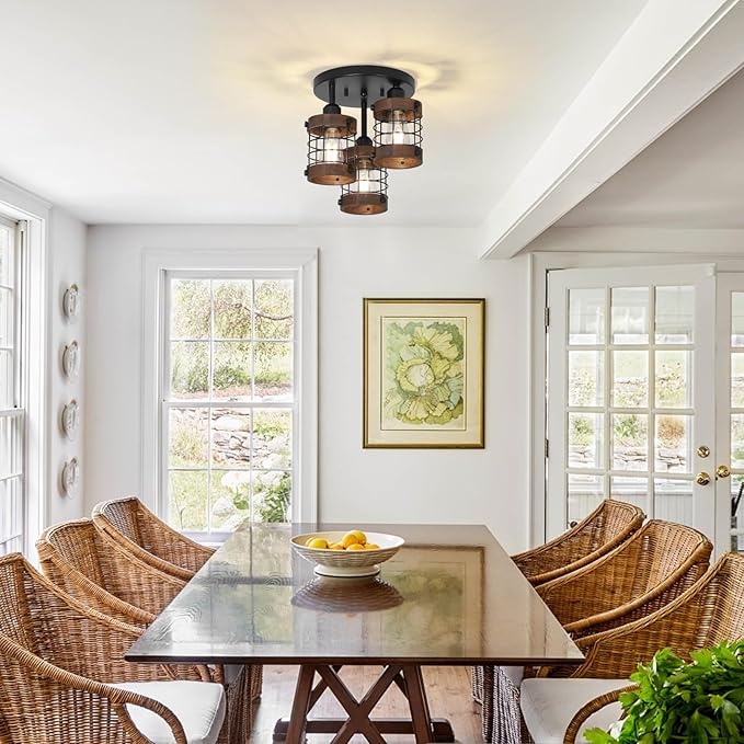 • ๐’๐ž๐ฆ๐ข ๐…๐ฅ๐ฎ๐ฌ๐ก ๐Œ๐จ๐ฎ๐ง๐ญ ๐‚๐ž๐ข๐ฅ๐ข๐ง๐  ๐‹๐ข๐ ๐ก๐ญ& ๐Ž๐ฉ๐ž๐ง ๐ƒ๐ž๐ฌ๐ข๐ ๐ง๏ผšThe light fixtures ceiling mount is an innovative lighting solution that is perfect for spaces with low ceilings. The lampshade with cage structure makes the light transmittance of the whole black chandelier very high, which meets the lighting requirements of most scenes. In addition, the ingenious combination of wood decoration and metal frame on the lampshade and the perfect interweaving of industrial style and farm style can play a very good decorative rustic light fixtures role no matter where in the room.