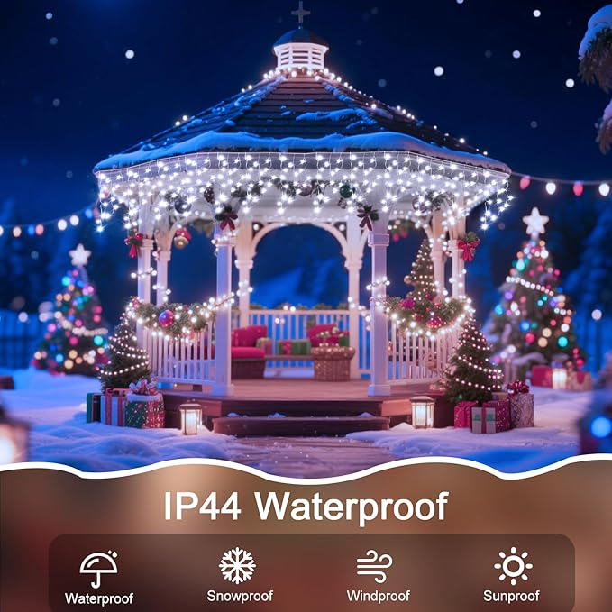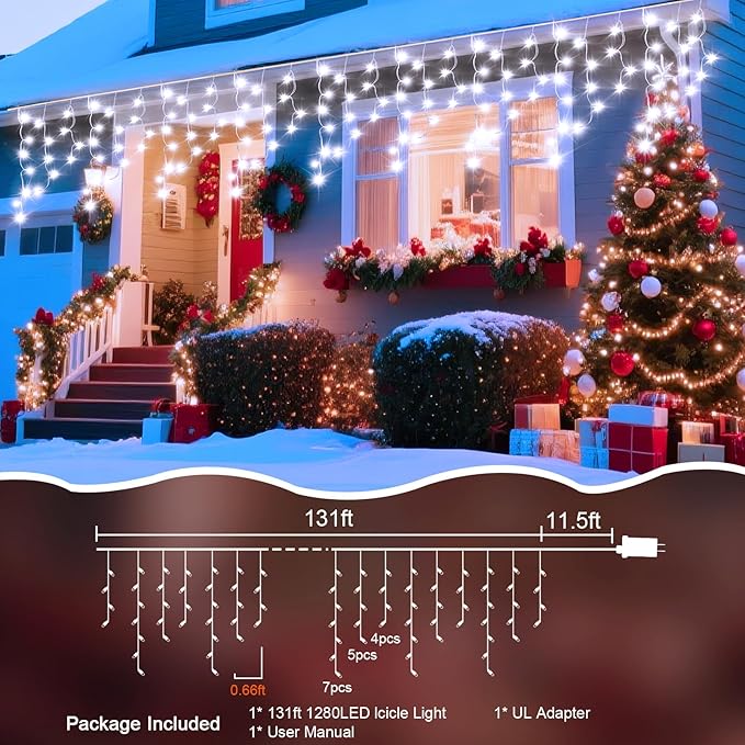 • Extra-Long Outdoor Christmas Light The Ideal Choice for Outdoor Decorations: Light up your home or yard! This Christmas twinkle light features 1280 LED bulbs, forming 240 elegant cascades, with a total length of 141 feet (131 feet light string + 10 feet extension cord). Made with 100% copper-core wiring, ensuring safe and reliable operation even when used for extended periods outdoors. These string lights for outside are the perfect Christmas decoration to enhance your outdoor ambiance.