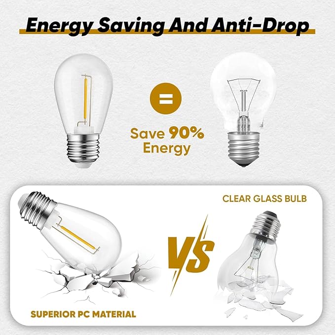 • Indoor & Outdoor - These outdoor string light bulbs are made of high-quality waterproof PC shell, which can effectively prevent accelerated aging caused by ultraviolet, Shatterproof and Weatherproof, suitable for indoor/outdoor lighting use at -20 ℃~60 ℃, not easy to fragile.