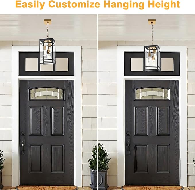 • Customizable Height & Universal Ceiling Fit: This exterior hanging porch light fixture can be easily adjusted the hanging chain up to 45 inches (115 cm) to perfectly suit your space. Installs effortlessly on flat, sloped, or vaulted ceilings. Includes all mounting hardware and clear instructions for a quick, DIY-friendly setup.