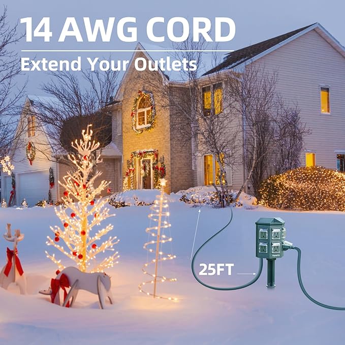 Outdoor Power Strip Timer Waterproof, Dusk to Dawn Light Sensor Countdown, 25 Feet Extension Cord, 6 Grounded Outlets for Christmas Decorations, ETL Listed
