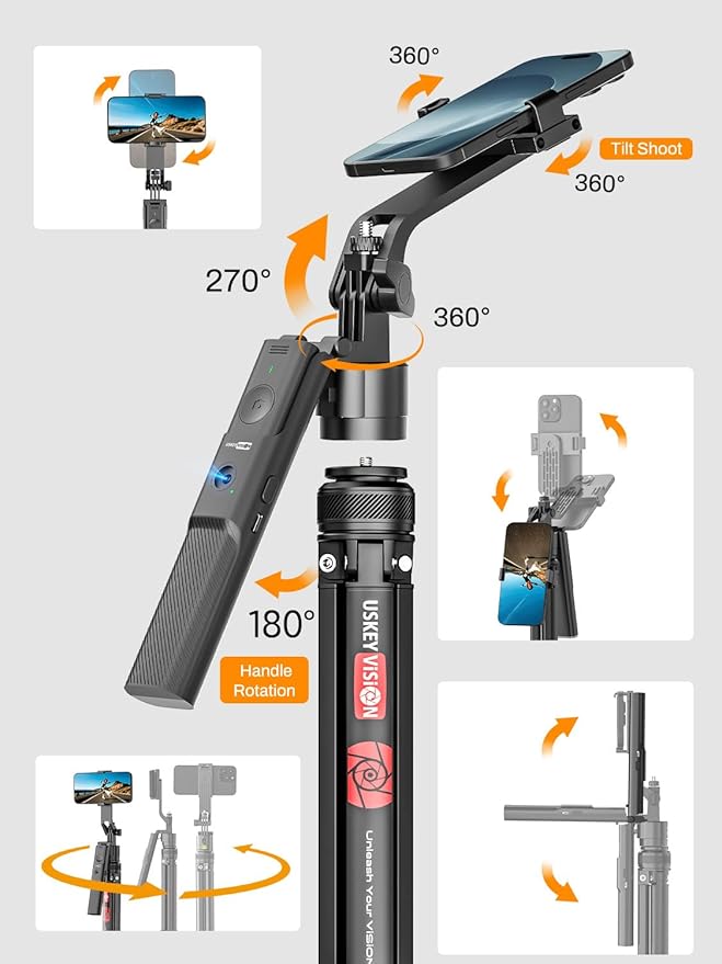 • 360° Rotation & Multi-angle Adjustment: The face tracking tripod can realize shooting at various heights and angles, supports 360° rotation, and can shoot horizontally, vertically, and overhead, providing you with a wider field of view to meet your needs on different occasions. Ideal for live streaming, video calls, and content creation.