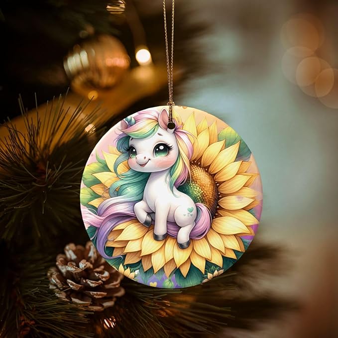 Cartoon Unicorn Sunflower Christmas Ornaments, Christmas Decorations Xmas Tree Hanging Ornaments, Round Ceramic Festive Keepsake Gift for Xmas Decorations Holiday Home Decor