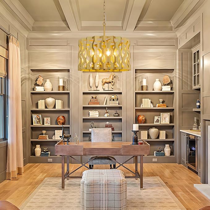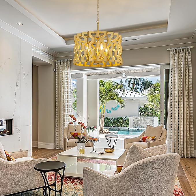 • Art deco chandelier: Inspired by classic American farmhouse and modern aesthetics, this chandelier geometric hollowing out and a rich gold finish. It brings a warm, nostalgic charm to your living room, effortlessly becoming the focal point that ties
