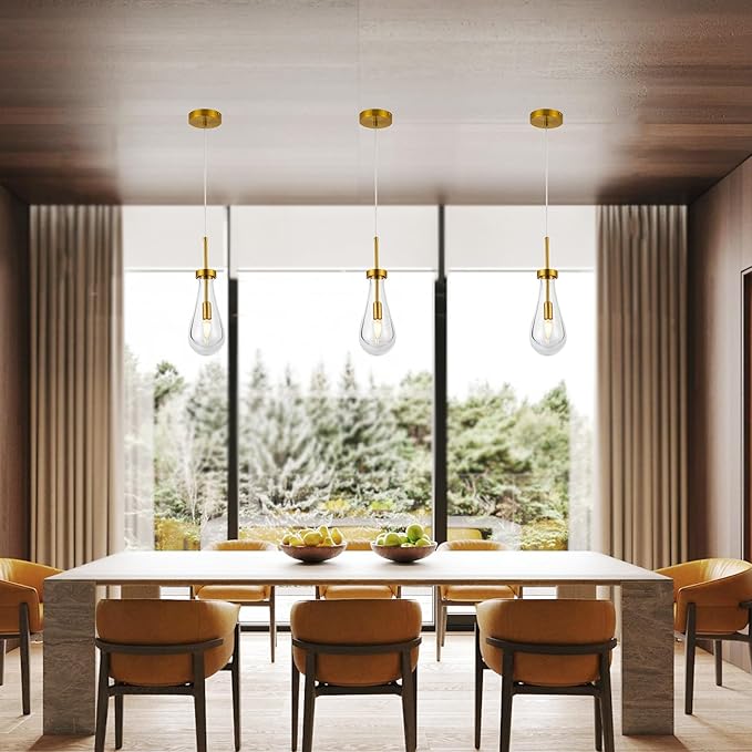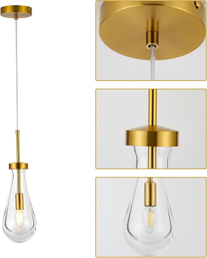Raindrop Pendant Lights for Kitchen Island Dining Room, Handblown Teardrop Glass Kitchen Light Fixtures Luxury 1-Light Brushed Brass Pendant Lights Hanging Lamps for Bedroom Dining Table, Hallway