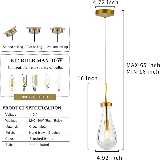 • 【Easy Installation】Raindrop pendant light for kitchen island comes with E12 bulb, all hardware needed for installation is included in the package, you just need to connect the wires and fix the base to the ceiling, place the glass shade, and the bulb. When cleaning, please take care to wipe with a soft dry cloth to prevent damage to the surface.