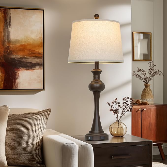 • LED Bulb and Upgraded Linen Shade: No need to worry about purchasing separate bulbs for these nightstand lamps . We have gone the extra mile by including two premium E26 LED bulbs that perfectly complement the 3-way dimmable lamps for living room end tables. Experience lighting perfection with our nightstand lamps that boast a flicker-free and ultra-quiet operation. Indulge in the tranquil ambiance and be captivated by the mesmerizing glow that these brown bedroom lamp effortlessly emit