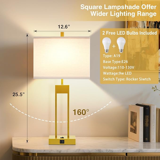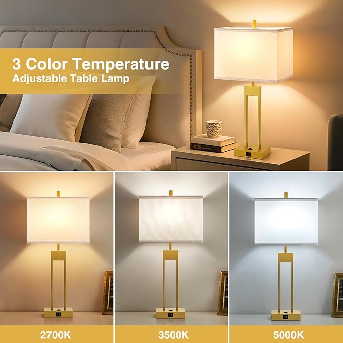 GyroVu 25.5" Nightstand Table Lamps for Bedrooms Set of 2, Bedside Lamp with USB C+A, 3 Colors Changeable Living Room Lamp, Modern Night Stand Lamps for Bed Side Guest Room Reading, Gold+White Shade