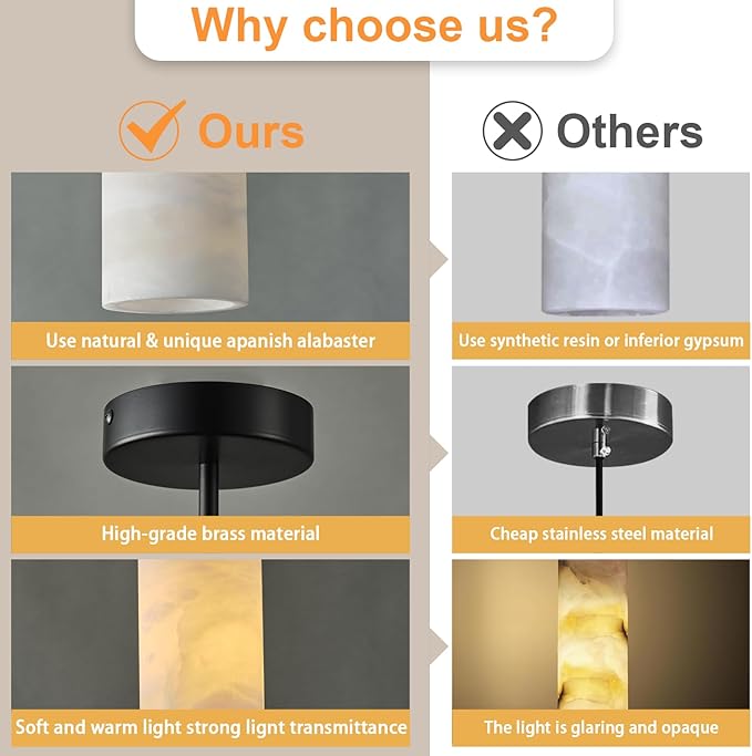 • 【Natural Spanish Alabaster】Alabaster pendant lights kitchen island is made of alabaster imported from Spain, a natural stone solidified by volcanic lava for millions of years. It is strong and durable, and the lighting effect is bright and non-glare. Each piece of alabaster is carefully selected and hand-polished, presenting a delicate and charming appearance, enhancing the natural beauty of the stone.